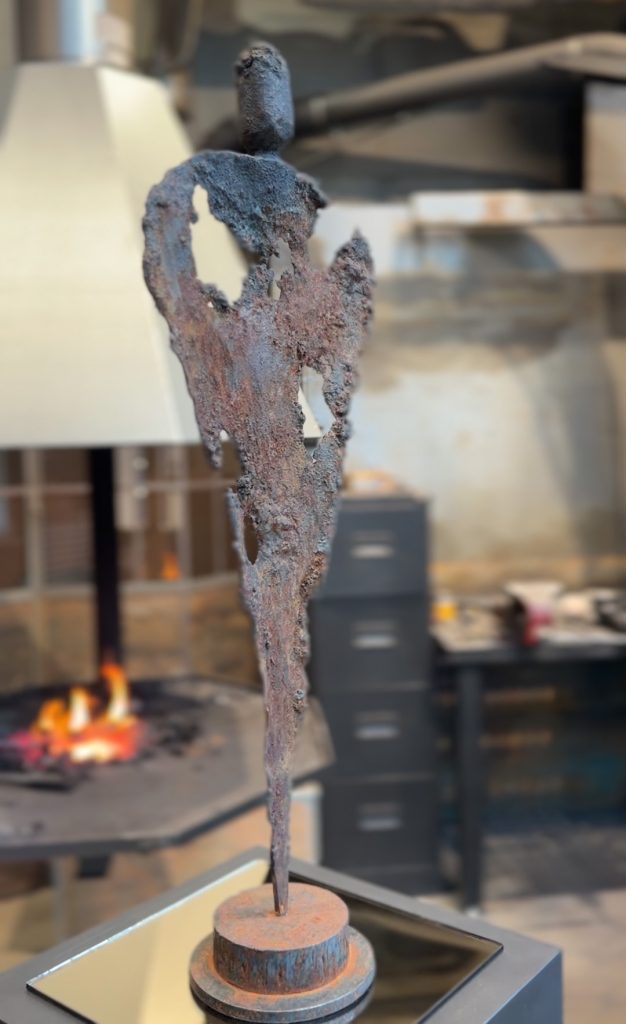 – Lar du materialets historie styre uttrykket, eller tvinger du det inn i en ny form?– Jeg prøver å lytte til materialet. Når jeg får en massiv stålblokk, handler det om å finne ut hva den kan bli. Noen ganger ser jeg for meg en langstrakt figur, andre ganger noe helt annet. Jeg jobber ofte med flere skulpturer samtidig, og lar prosessen og stålet vise vei.