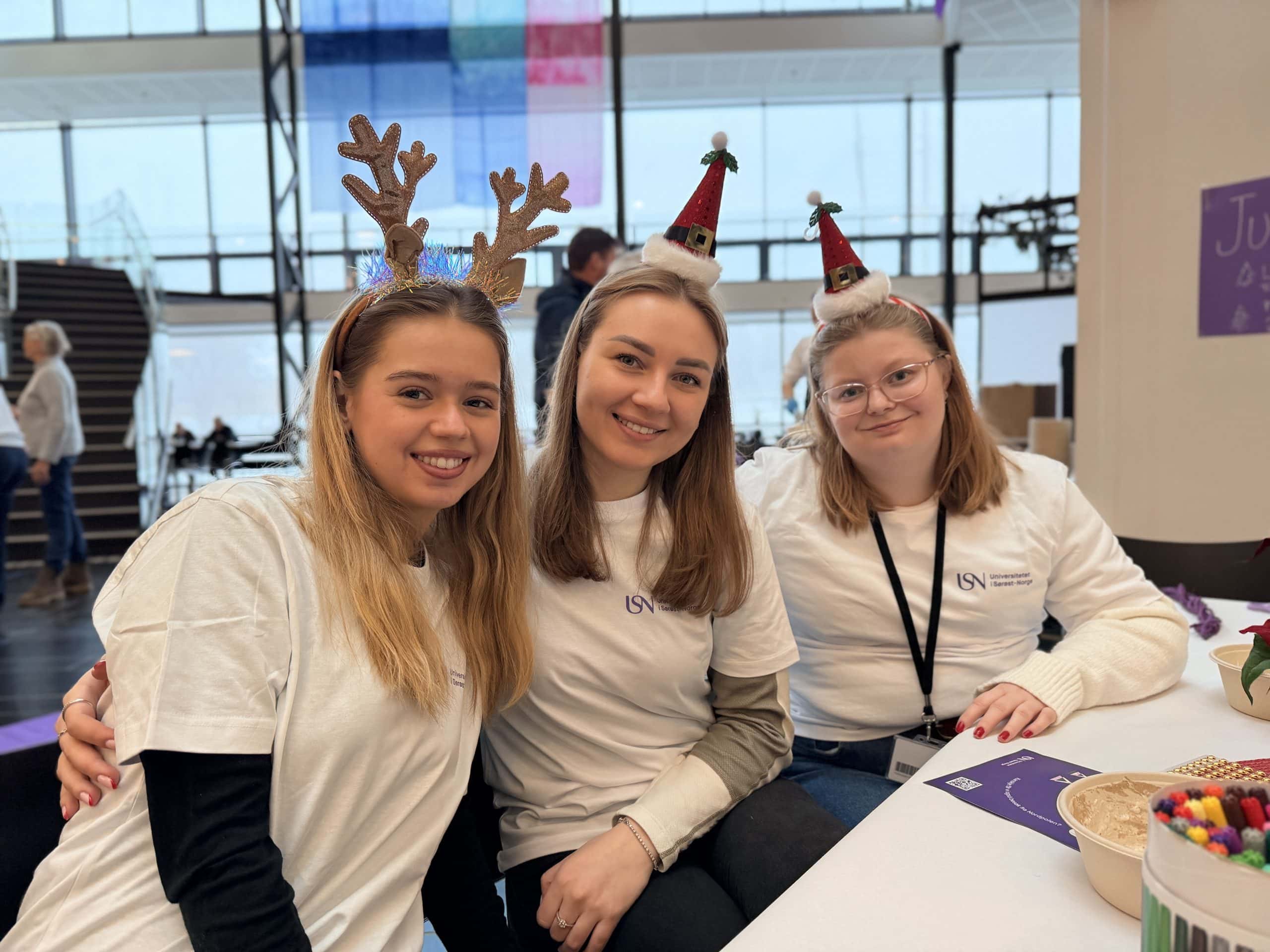 Studentene Karoline Wigaard Johnsen, Katerina Trachova og Thea Hafskjold Hagen ved grunnskolelærerutdanningen er godt fornøyd med både undervisningen og miljøet på USN.